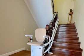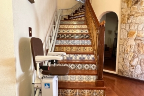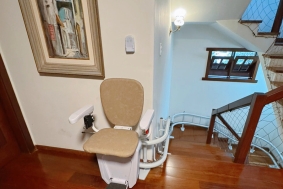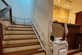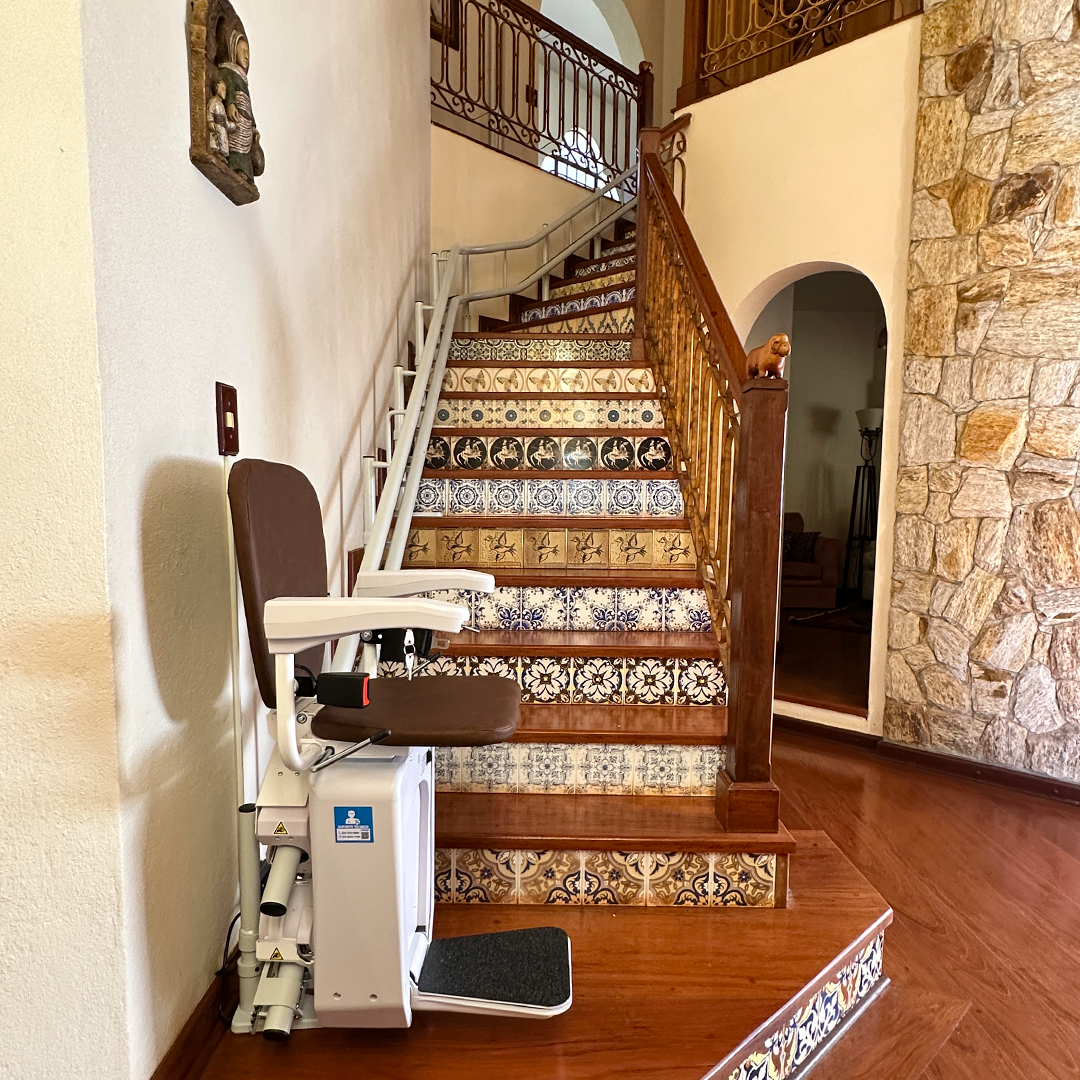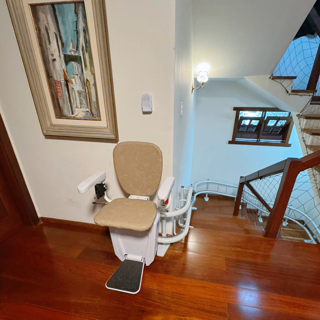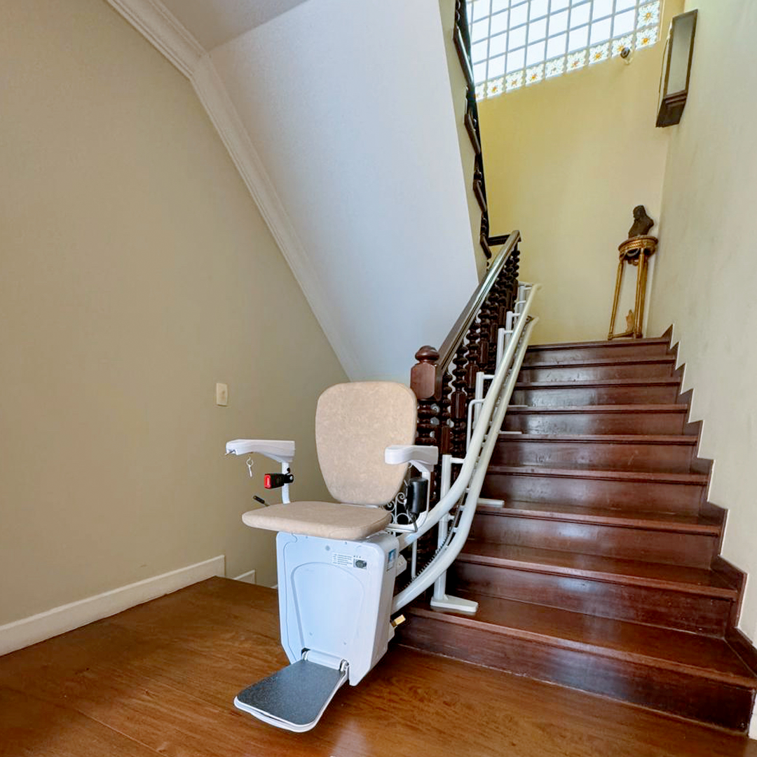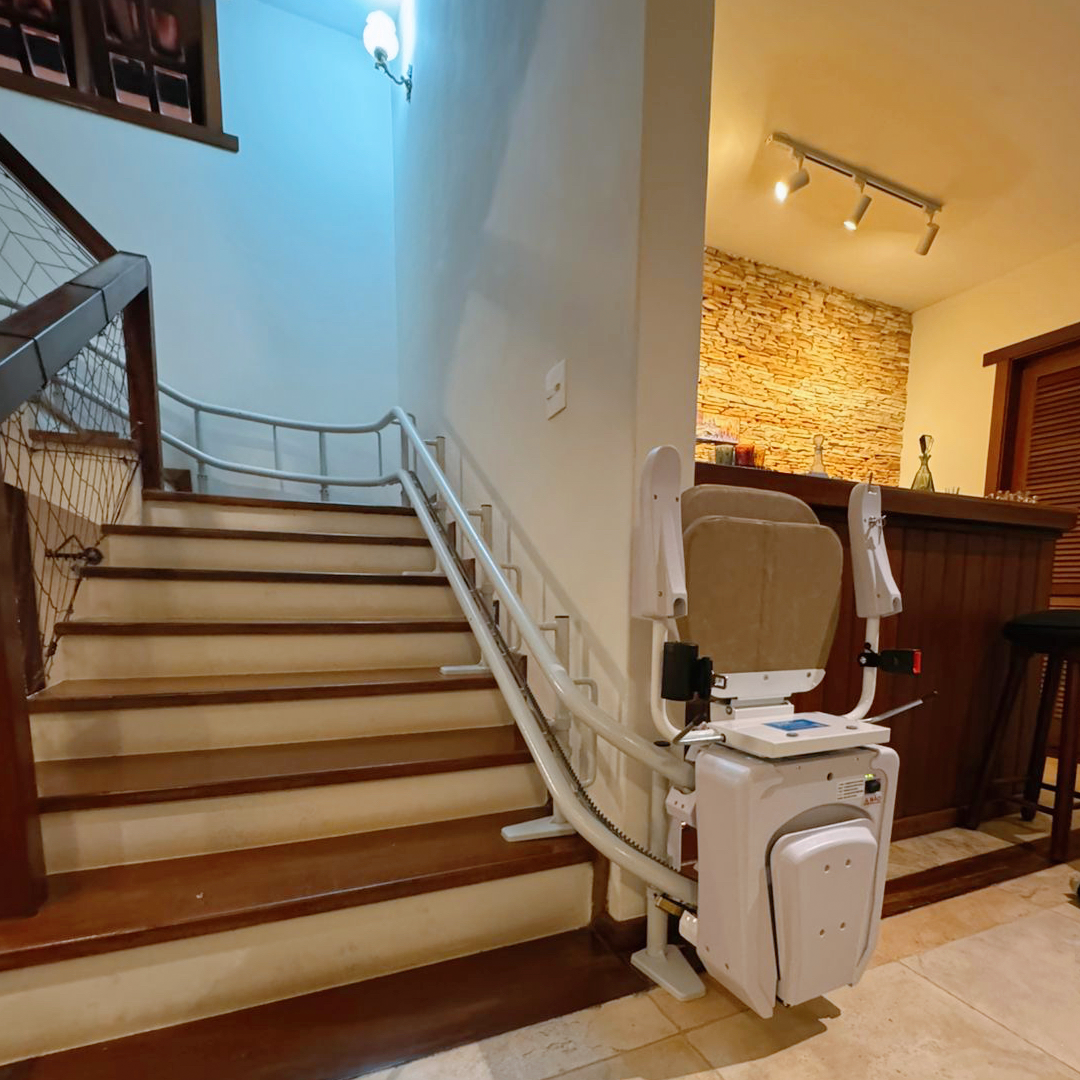 A Cadeira Elevador Alpha foi desenvolvida especialmente para escadas em curva, permitindo múltiplas paradas em diferentes patamares, adaptando-se à configuração do imóvel.